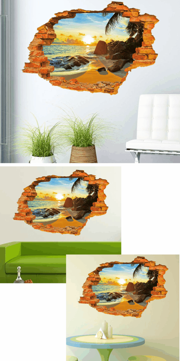 ウォールステッカー 窓 壁穴 おしゃれ 風景 シール お風呂 写真 トリックアート 南国 ビーチ 海 海辺 ステッカー レンガ 穴 インテリアシール 植物 ヤシの木 波 岩 木 サーフ 西海岸 ウオールステッカー 太陽 専門店 夕日 景色 モダン カフェ ハワイ